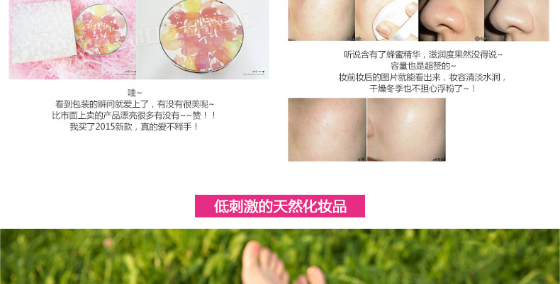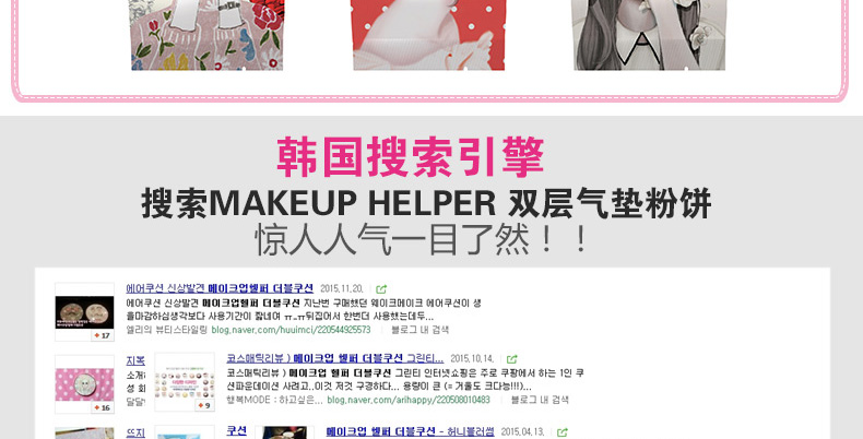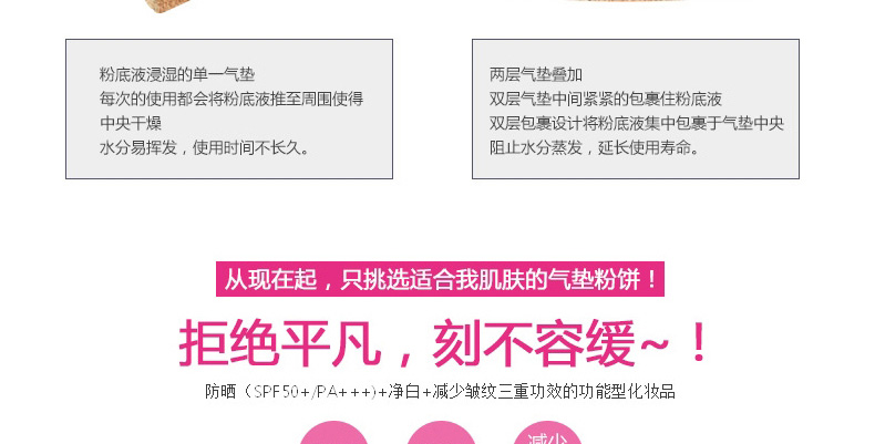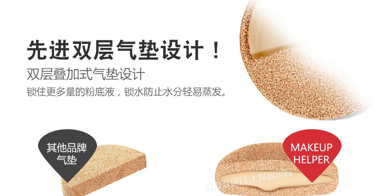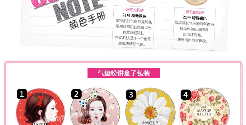 韓國Makeup Helper雙層氣墊BB霜粉餅#21號色 全天候水潤氣墊粉撲 遮瑕防曬 —— 1.不同的圖案代表不同的香型,給你視覺與嗅覺的雙重享受。 2.先進的雙層氣墊設計,鎖住水分,鎖住粉底液,效果滋潤更耐用。 3.10中粉餅包裝圖案,2種色號,還單獨有賣替換裝哦。 |