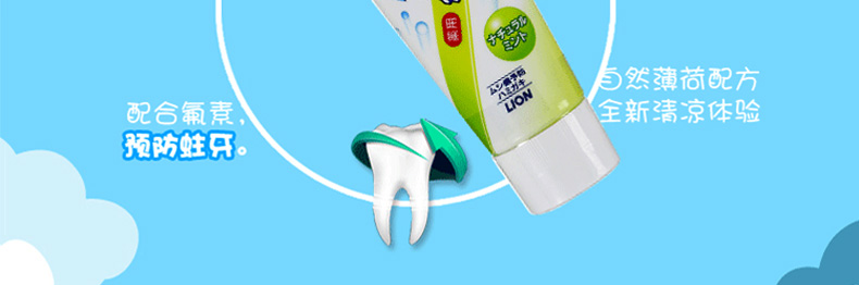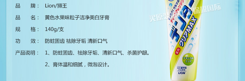 日本獅王Lion黃色水果味粒子潔凈美白牙膏140g 防蛀固齒殺菌護齦 一支裝/兩支裝—— 1、水果味、薄荷味和超涼薄荷味可選。 2、防蛀固齒、祛除牙垢、清新口氣、殺菌護齦。 3、膏體溫和細膩,微泡設計。 |