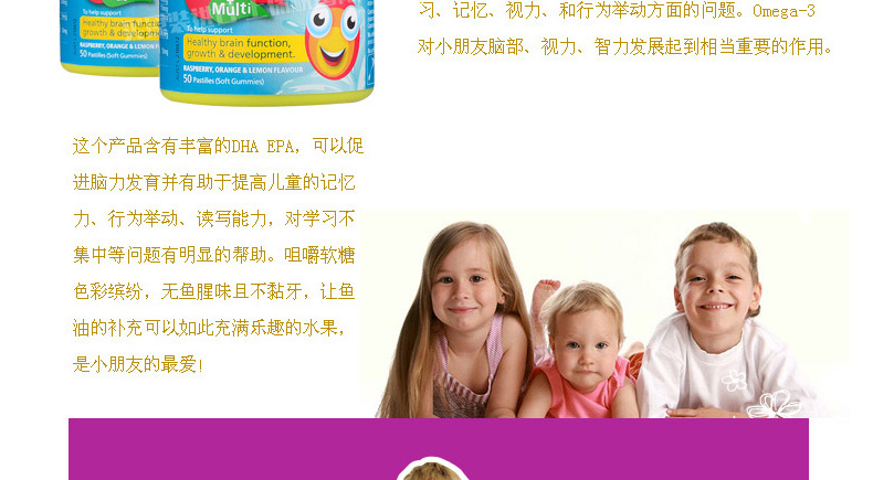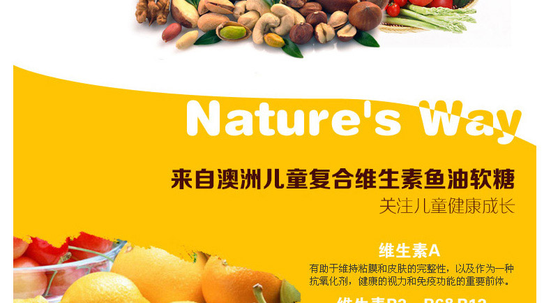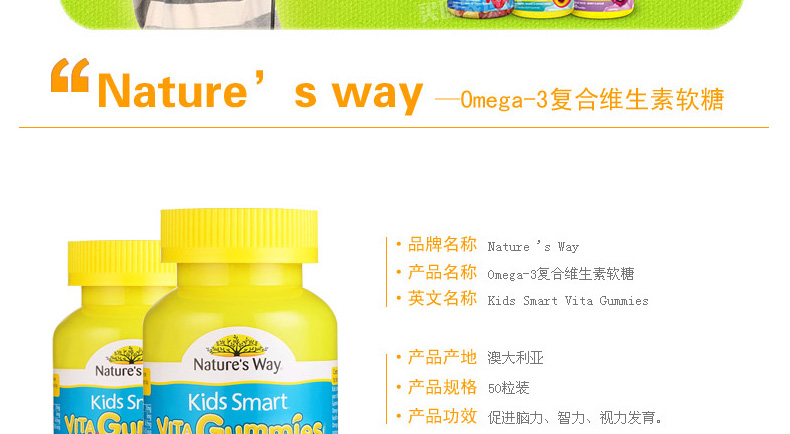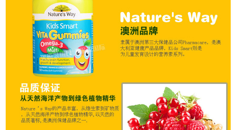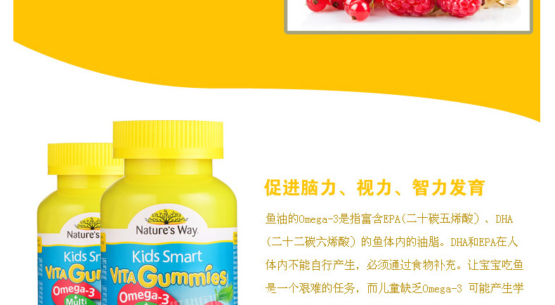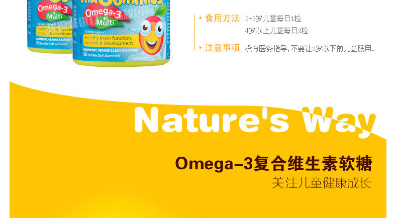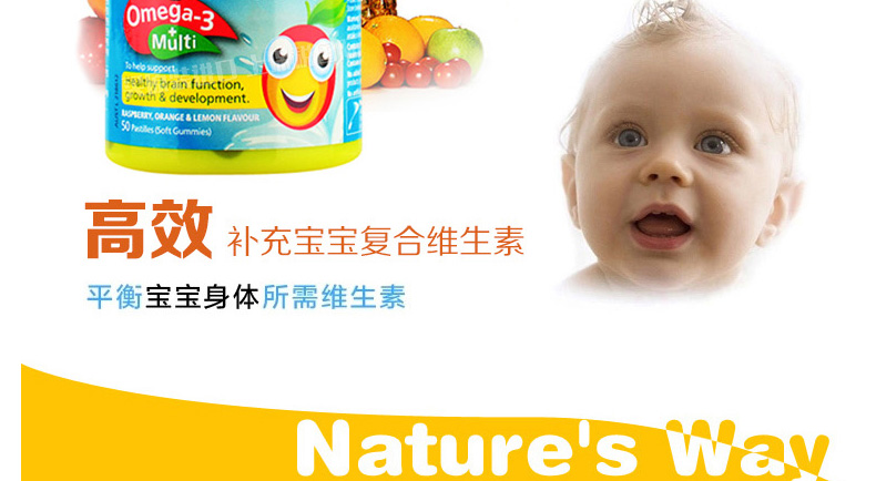 澳大利亞Natures way 佳思敏Omega-3多維魚油軟糖 2歲以上寶寶必備 50粒/瓶—— 1、為視力提供全方位保護,健康新動力。 2、含有的礦物質碘促進甲狀腺素的合成,進而促進神經系統發育。 |