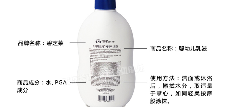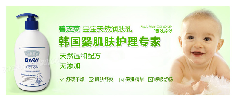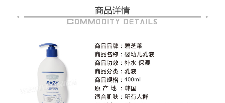 韓國碧芝萊400ml裝嬰幼兒乳液寶寶專用乳液 持久滋潤溫和清爽—— 1、補水保濕、清爽不黏膩。 2、溫和柔軟、親膚性強、散發(fā)淡淡清香。 3、富含納豆中萃取的高保濕成分和天然植物油精華! |
