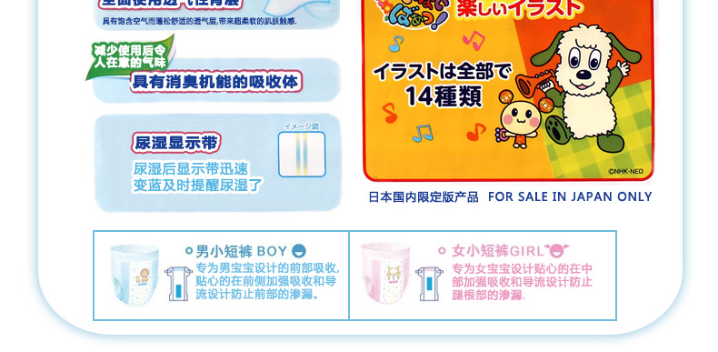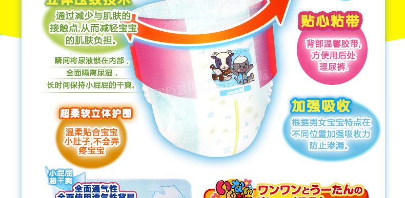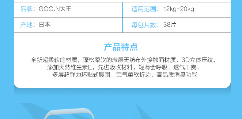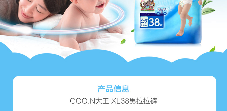 日本GOO.N/大王 男寶寶拉拉褲 XL38片 男小短褲式紙尿褲加大號柔軟透氣 適用12kg-20kg男孩—— 1、多層彈性腰圍,不會勒疼寶寶。 2、天然維生素E均勻涂抹在表面,防止細菌侵入肌膚細胞中。 3、3D立體壓紋技術(shù),減輕寶寶肌膚負擔(dān)。 |