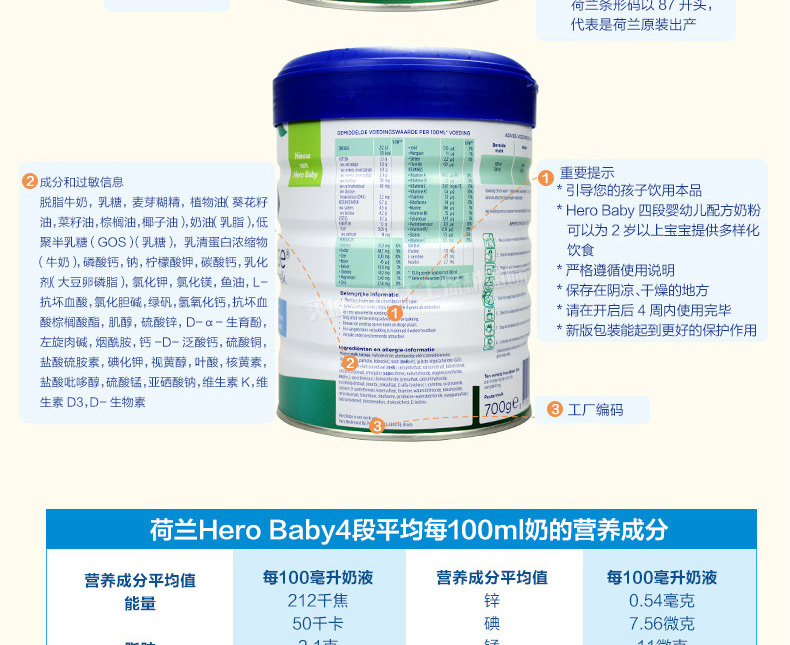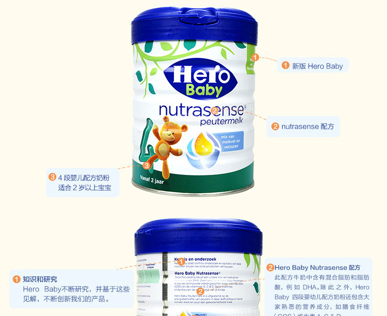 荷蘭美素Hero Baby白金版奶粉4段2歲以上寶寶奶粉700g —— 1、升級配方,近似母乳,口感醇正。 2、更堅固的鐵罐裝。 |