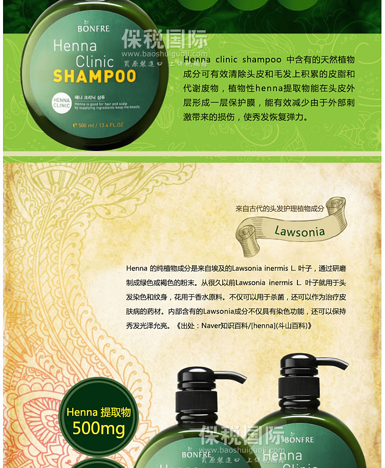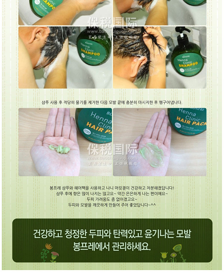 韓國BONFRE指甲花特效修護發膜 500ml—— 含有天然保濕因子神經酰胺,防止外部水分流失,呵護滋潤毛發,使用植物性保濕劑,柔順地撫摸毛發,無油膩,賦予清爽的使用感,植物性指甲花提取物在頭發表皮層形成保護膜,修護頭發,供應營養,呵護健康發質。 |