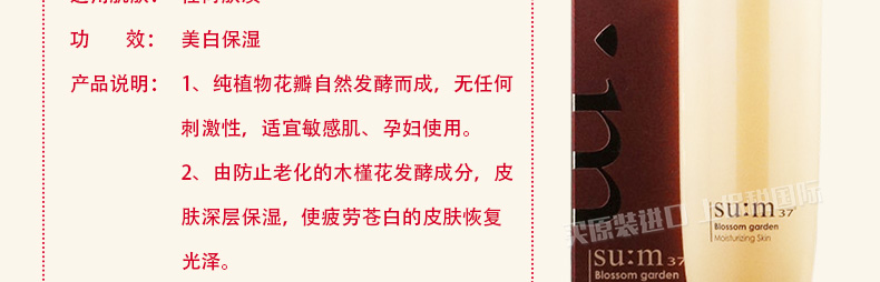 韓國(guó)SU:M37°呼吸 秘密花園保濕水 孕婦可用溫和爽膚水 美白去黃 150ml/瓶—— 1、純植物花瓣自然發(fā)酵而成,無任何刺激性,適宜敏感肌、孕婦使用。 2、由防止老化的木槿花發(fā)酵成分,皮膚深層保濕,使疲勞蒼白的皮膚恢復(fù)光澤。 |
