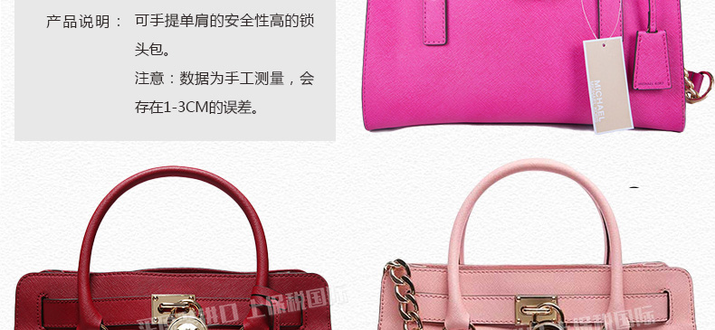 邁克.科爾斯Michael Kors中號(hào)鎖頭包手提單肩包MK女包女士包包30S2GHMS3L 玫紅/酒紅/粉紅/深藍(lán)/湖水藍(lán)5色 安全性高—— 1、玫紅、酒紅、粉紅、深藍(lán)和湖水藍(lán)5色任選。 2、可手提單肩的安全性高的鎖頭包。 注意:數(shù)據(jù)為手工測(cè)量,會(huì)存在1-3CM的誤差。 |