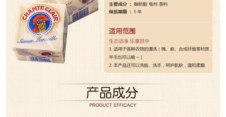 意大利 大公雞管家馬賽洗衣皂 Chante clair意大利雞頭 優(yōu)質(zhì)配方祛除頑固污漬呵護(hù)肌膚 溫和柔順 300g/塊 |
