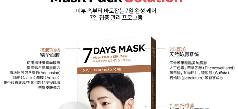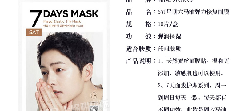 宋仲基代言韓國 Forencos 7天面膜 SAT星期六馬油彈力恢復面膜 7DAYS七天集中護理系列蠶絲面膜 周六款 10片/盒—— 1、天然蠶絲面膜貼,溫和無添加,敏感肌也可以使用。 2、7天面膜護理系列,周一到周日每天一款,每天都有不同功效,此款是周六馬油彈力面膜。 |