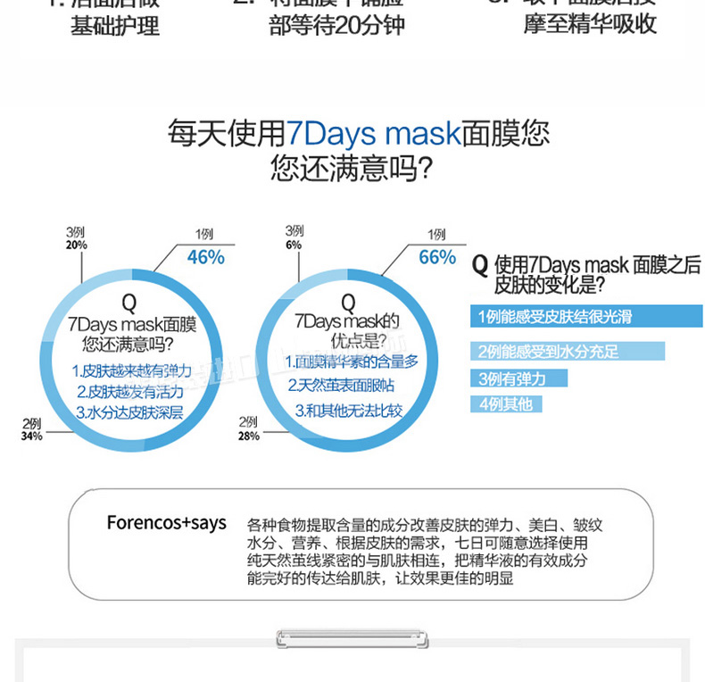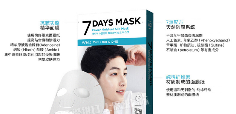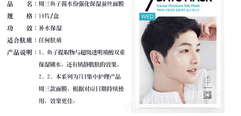 宋仲基代言 韓國 Forencos 周三魚子醬水份強(qiáng)化保濕蠶絲面膜7DAYS七天集中護(hù)理面膜 WED星期三款 10片/盒 |