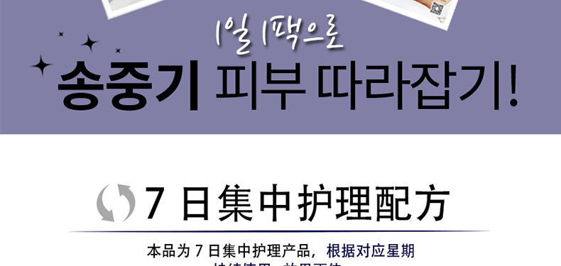 1、專為無力松弛肌膚,提供彈性護(hù)理。2、本系列為7日集中護(hù)理產(chǎn)品,根據(jù)對應(yīng)日期持續(xù)使用,效果更佳。 |