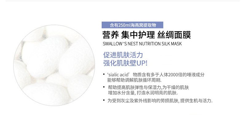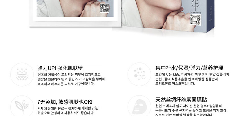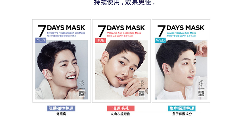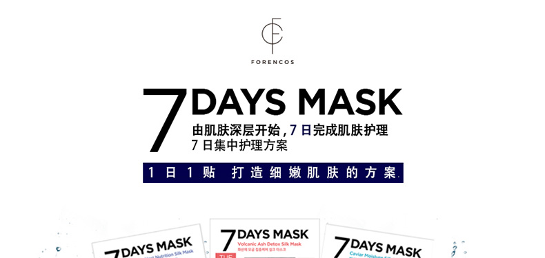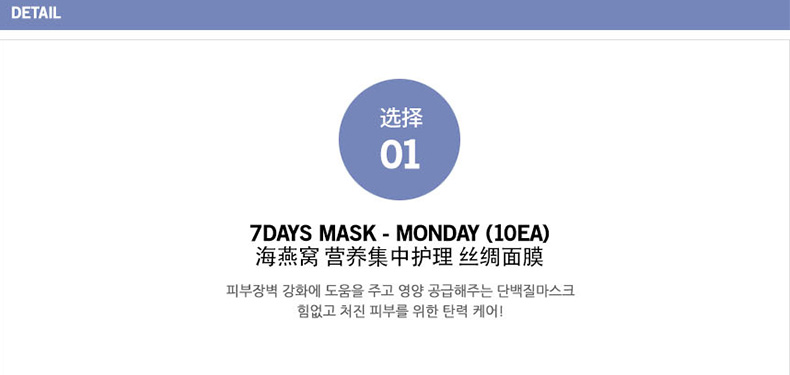 商品名稱 | 韓國Forencos 宋仲基7天面膜 MON星期一 海洋燕窩營養(yǎng)面膜 7DAYS七天集中護(hù)理系列蠶絲面膜 提升彈力周一款 10片/盒 | ||