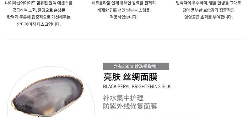 韓國Forencos 宋仲基代言7天面膜 SUN 星期日黑珍珠亮白蠶絲面膜 7DAYS七天集中護理系列 周日款 10片/盒—— 1、純棉纖維素材質面膜紙,提高面膜貼合度和滲透力。 2、含珍珠萃取成分、各種礦物質及氨基酸,打造亮白水嫩肌。 |