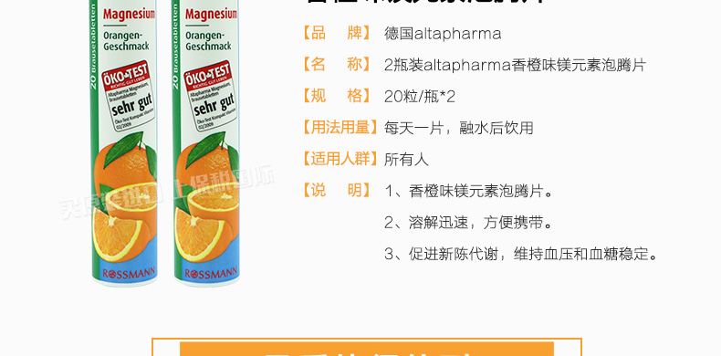 2瓶裝altapharma香橙味VC泡騰片鎂元素維C泡騰片 美容養顏促進新陳代謝 20粒/瓶—— 1、美容養顏、抗氧化。 2、促進新陳代謝,增強肌肉和神經生長。3、溶解迅速,方便攜帶。 |