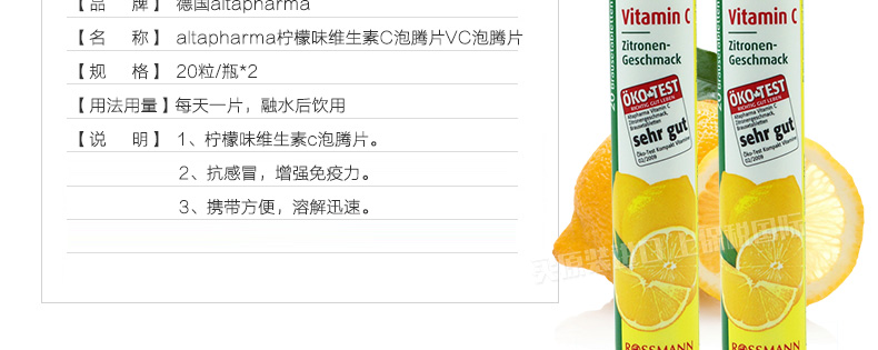 兩瓶裝altapharma檸檬味維生素C泡騰片VC泡騰片 增免疫抗感冒 20粒/瓶—— 1、檸檬味維生素c泡騰片。 2、抗感冒,增強免疫力。 3、攜帶方便,溶解迅速。 |