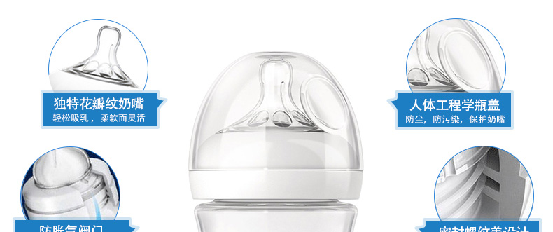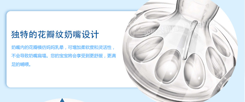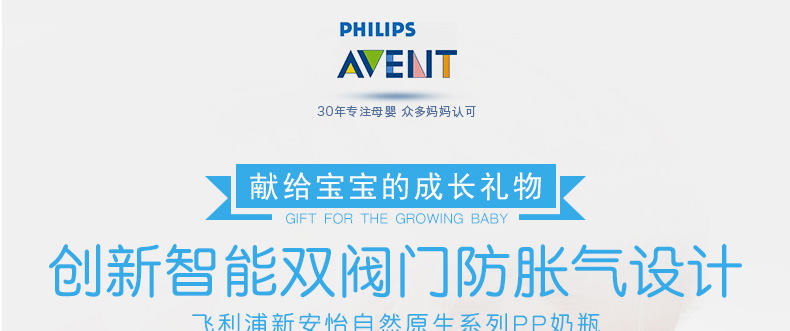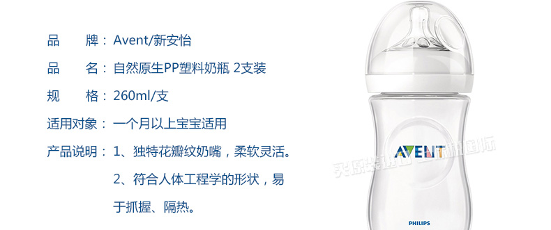 2支裝 英國 Avent/新安怡 飛利浦自然原生PP塑料奶瓶260毫升 一個月以上寶寶適用 —— 1、獨特花瓣紋奶嘴,柔軟靈活。 2、符合人體工程學的形狀,易于抓握、隔熱。 |