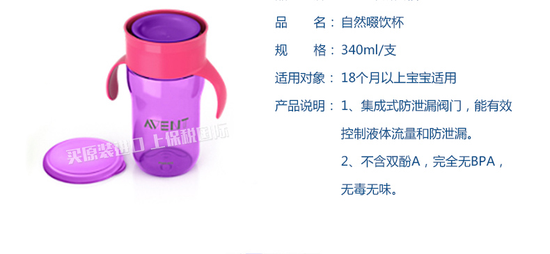 英國 Avent/新安怡飛利浦 自然啜飲杯340毫升一只裝 顏色隨機(jī)發(fā) 18個月以上寶寶適用340ml/支—— 1、集成式防泄漏閥門,能有效控制液體流量和防泄漏。 2、不含雙酚A,完全無BPA,無毒無味。 |