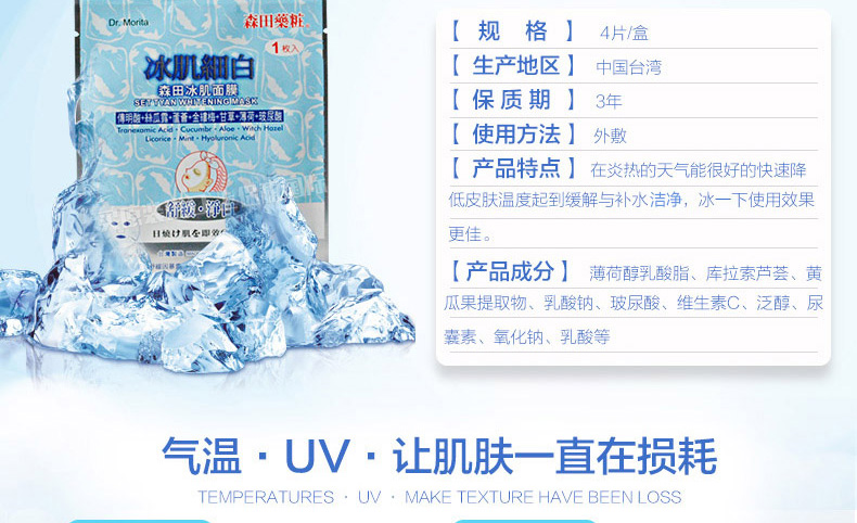 森田藥妝冰肌細(xì)白修護(hù)面膜貼4片 打造水嫩細(xì)膩的冰肌玉膚 一盒/兩盒—— 1、含有黃瓜果、蘆薈、洋甘菊萃取物及玻尿酸等護(hù)膚成分。 2、清爽控油、保濕舒緩、緊致抗皺。 3、能迅速冰鎮(zhèn)肌膚,舒緩紫外線的傷害! |