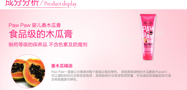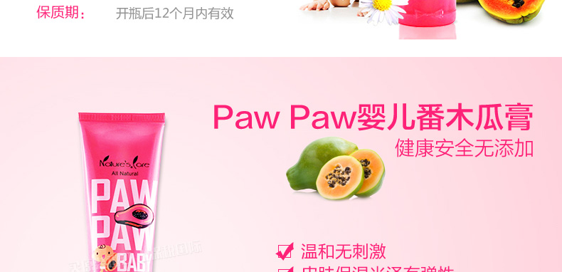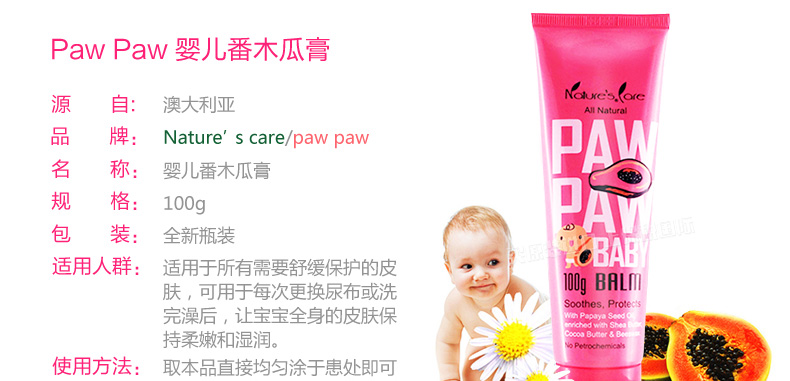 NATURE'S CARE PawPaw 嬰兒用番木瓜萬能膏木瓜膏100g 保濕舒緩促進傷口愈合—— 1、含有豐富的木瓜酵素等有效護膚成分。 2、鎖水保濕、鎮靜舒緩、加速傷口愈合,抗皺。 |