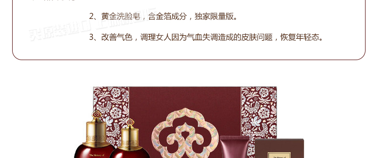2016年4月專柜限量版 韓國whoo后 津律享三件套 水乳面霜帶黃金皂+3件中小樣套盒 補水抗皺提亮膚色—— 1、水乳面霜黃金皂+贈品3件中小樣。 2、黃金洗臉皂,含金箔成分,限量版。 3、改善氣色,調理女人因為氣血失調造成的皮膚問題,恢復年輕態。 |