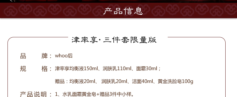 津率享均衡液150ml、潤膚乳110ml、面霜30ml;贈品:均衡液20ml、潤膚乳20ml、潔面40ml、黃金洗臉皂100g。 |
