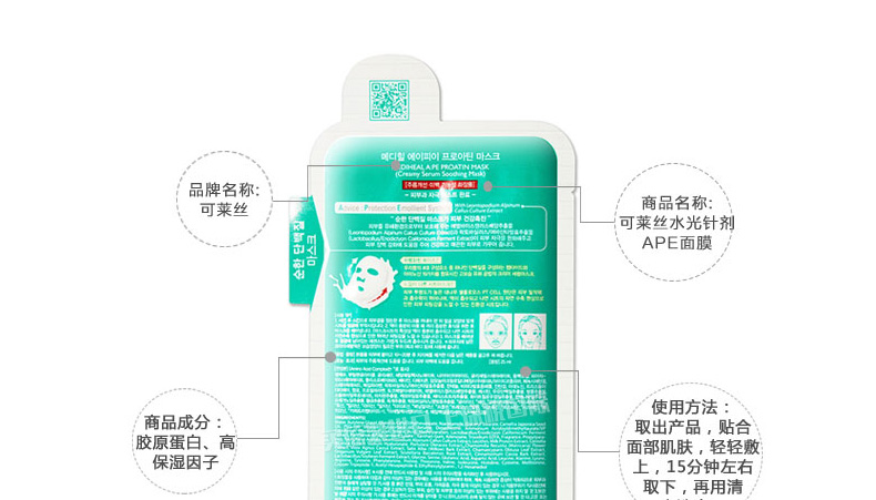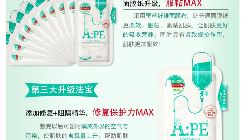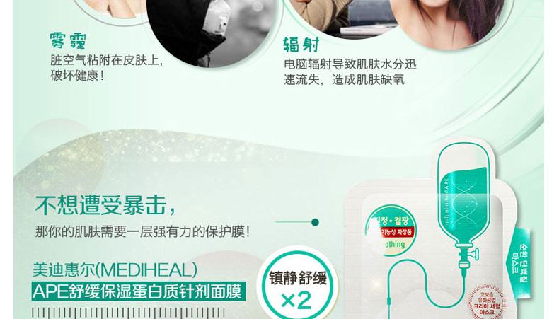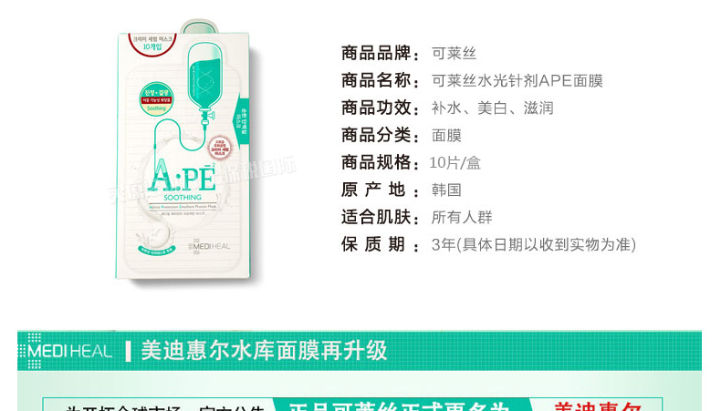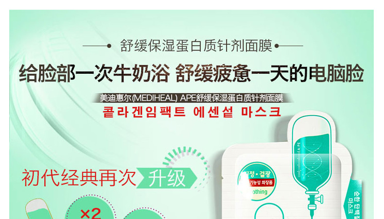韓國美迪惠爾可萊絲MEDIHEAL水光針劑APE面膜APE水光針面膜 舒緩保濕 10片/盒 一盒/兩盒—— 1、富含膠原蛋白、數(shù)十種氨基酸及保濕因子等護(hù)膚成分。 2、超薄蠶絲纖維面膜,更服帖更易吸收。 3、鎮(zhèn)靜舒緩、保濕彈力、排濁去痘印! |