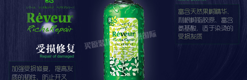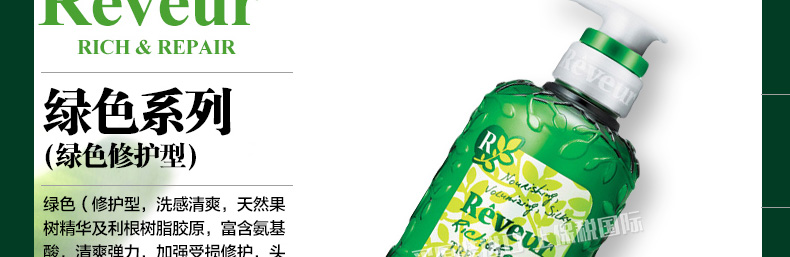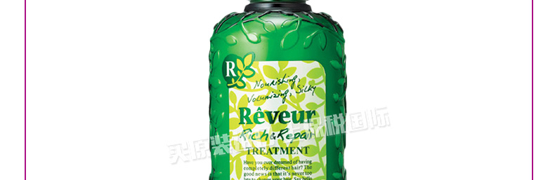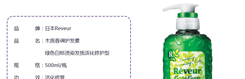 日本Reveur 綠色白標無硅油護發素 500ml/瓶—— 1、適合喜歡燙染發人群,強力修復受損發質。 2、低泡易沖洗,清爽不油膩。 |