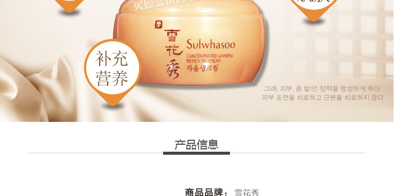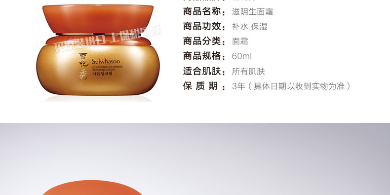 韓國直郵雪花秀Sulwhasoo滋陰生人參面霜60ml 煥活年輕“參”機 —— 1、含有高麗人參萃取物、桑根、黃芪等珍貴中草藥精粹。 2、質地細膩清爽,易吸收。 3、補水保濕、抗皺祛黃、強化修護。 |