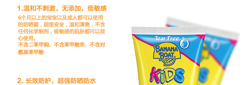 香蕉船Banana Boat兒童防曬乳SPF50 超強防曬防水 做陽光小萌娃 一支/兩支—— 1、0酒精、0色素的安全防曬配方,溫和不刺激。 2、天然礦物成分,水感清透不黏膩。 3、超強防曬防水的長效防護! |