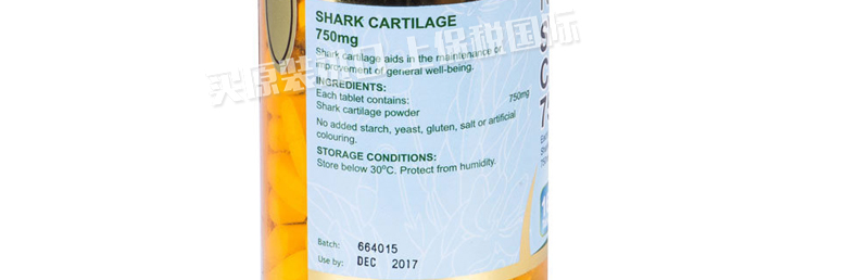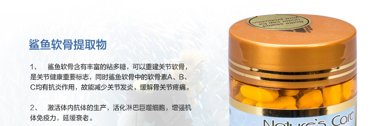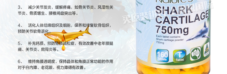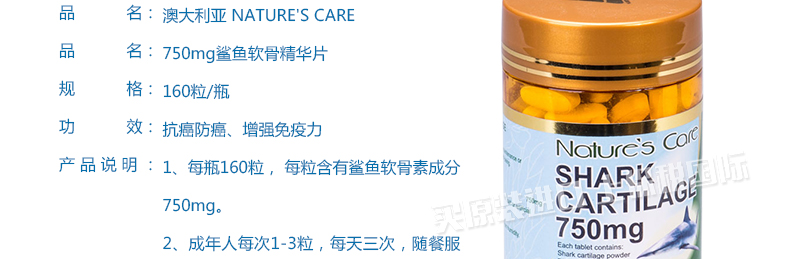 澳大利亞Nature's Care 750mg鯊魚軟骨精華片 納世凱爾軟骨素 增強免疫力緩解關節炎保健品160粒/瓶—— 1、每瓶160粒, 每粒含有鯊魚軟骨素成分750mg。 2、成年人每次1-3粒,每天三次,隨餐服用;建議早中晚吃飯時分別服用1片即可。 |