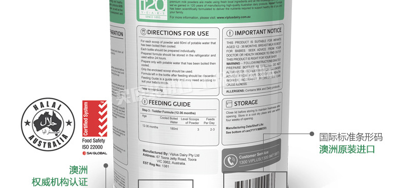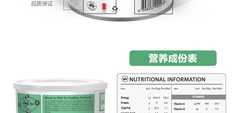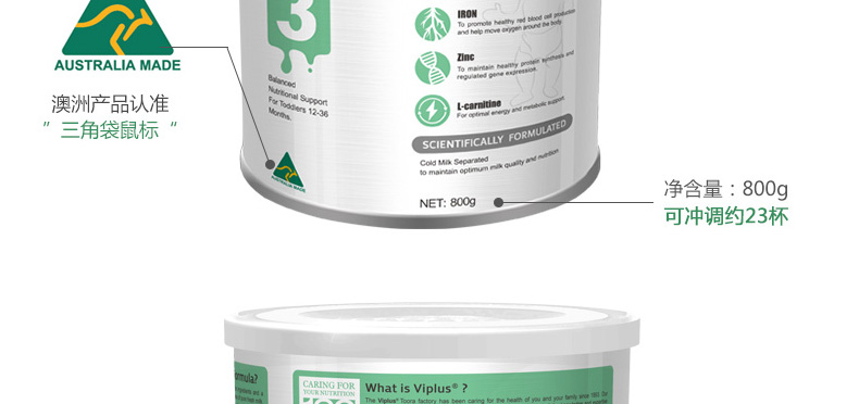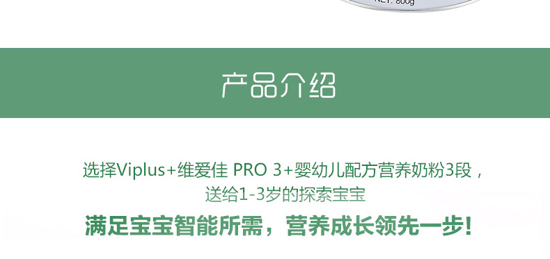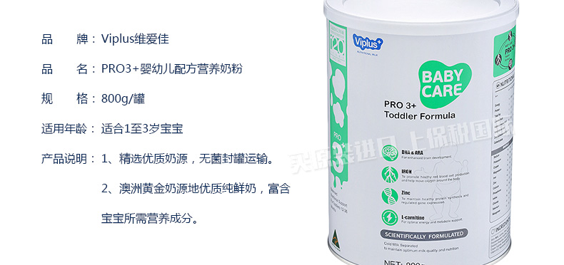 澳大利亞維愛佳Viplus 3段奶粉 PRO3+嬰幼兒配方營養奶粉 適合1至3歲寶寶 800g/罐—— 1、精選優質奶源,無菌封罐運輸。 2、澳洲黃金奶源地優質純鮮奶,富含寶寶所需營養成分。 |