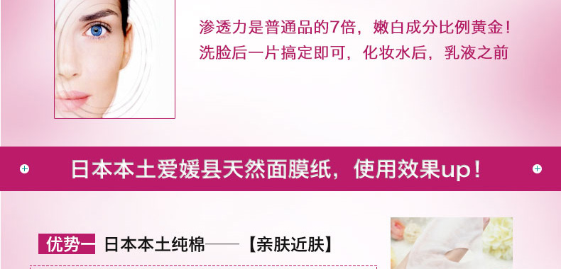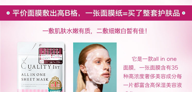 一包/兩包—— 1、35種美容精華,1片面膜=化妝水+乳液+美容液。 2、含有玻尿酸、熊果素、大豆精華等7大主要珍稀成分。 3、保濕嫩白、細致易吸收。 |