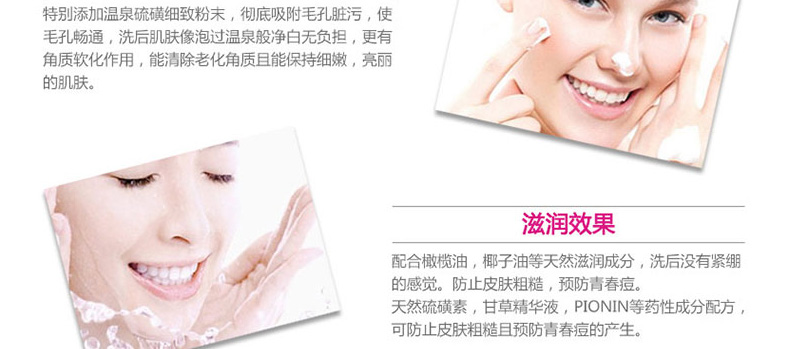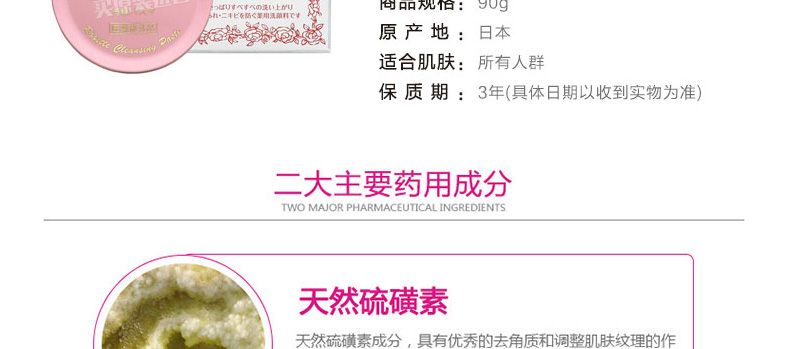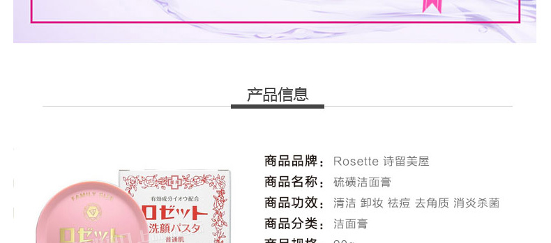 日本詩留美屋Rosette粉色裝硫磺潔面膏 任何肌膚用祛痘洗顏膏90g/盒 一塊/兩塊—— 1、清潔保濕、消炎殺菌、祛痘去角質。 2、含天然硫磺素、甘草精華兩大藥用成分。 |