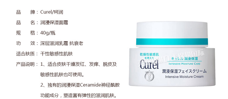 日本Curel/珂潤 潤浸保濕面霜 深層滋潤乳霜 抗衰老 干性敏感性肌膚40g/瓶—— 1、適合皮膚干燥發紅、發癢、脫皮及敏感性肌膚也可使用。 2、獨有的潤浸保濕Ceramide神經酰胺功能成分,塑造富有彈性的滋潤肌膚。 |