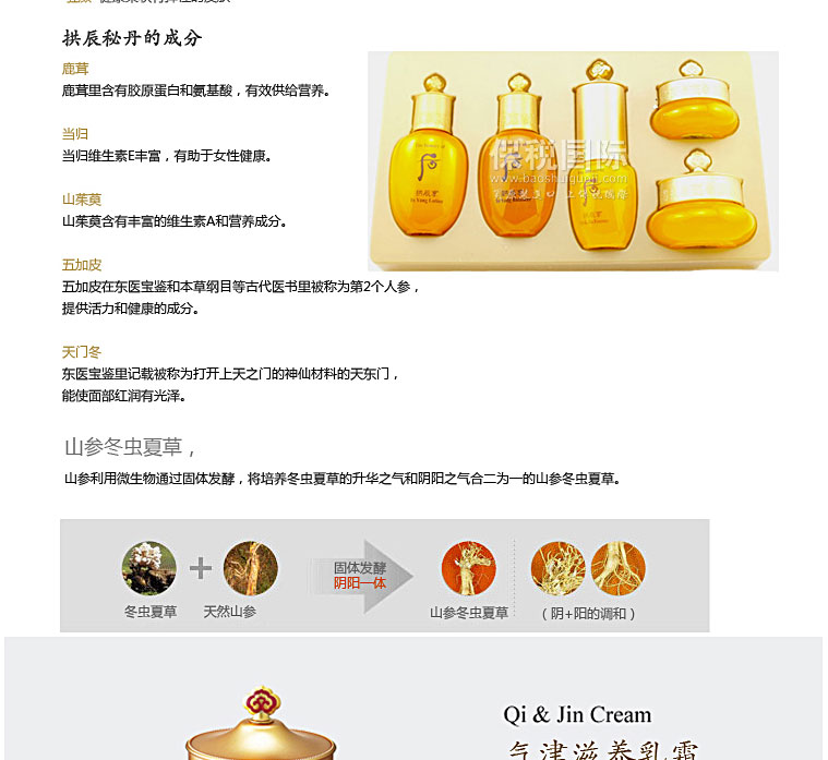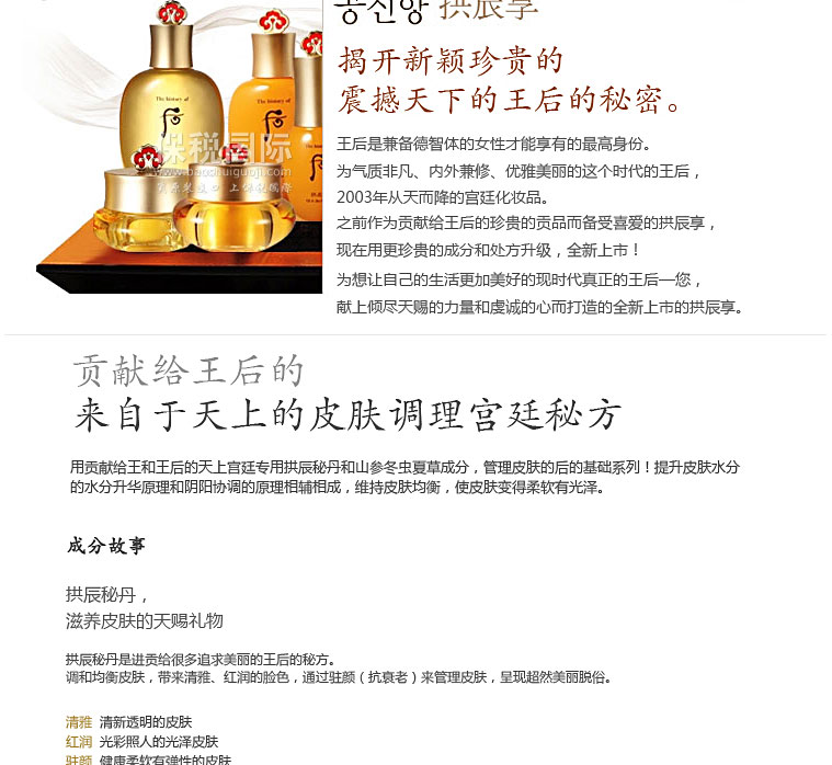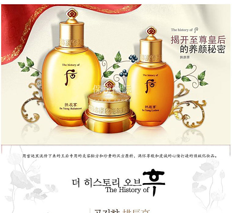 韓國LG Whoo/后拱辰享氣津滋養乳霜50ml—— 用貢獻給王和王后的天上宮廷專用拱辰秘丹和山參冬蟲夏草成分,管理皮膚的后的基礎系列!提升皮膚水分的水分升華原理和陰陽協調的原理相輔相成,維持皮膚均衡,使皮膚變得柔軟有光澤。 |