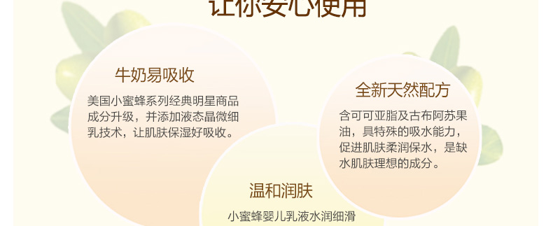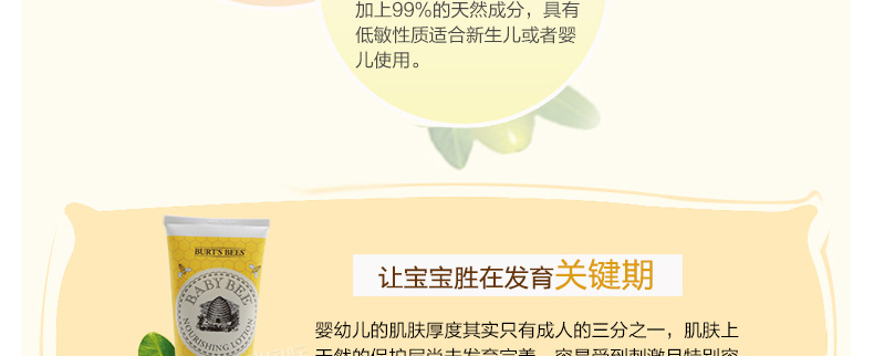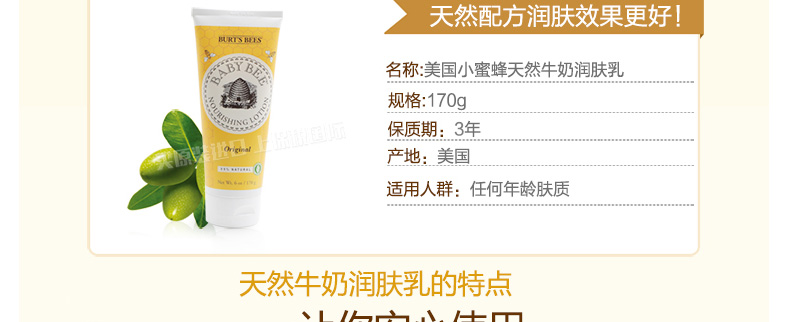 美國小蜜蜂Burt's Bees經典牛奶香寶寶潤膚乳潤膚露170g 天然安全的潤膚選擇 一支/兩支—— 1、含有牛奶、金盞花精華、椰子油及多種植物油護膚成分。 2、質地清淡細致,吸收迅速不油膩。 3、潤膚滋養修護,柔嫩細滑。 |
