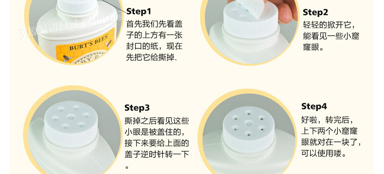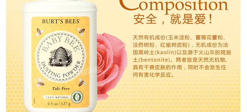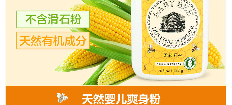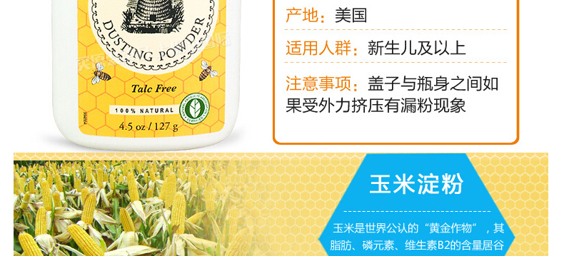 美國小蜜蜂Burt's Bees香體爽身粉玉米痱子粉127g 給寶寶四季的干爽呵護 一支/兩支—— 1、以玉米為原料,天然溫和不過敏。 2、粉質細膩,易附著,不堵塞汗腺,干爽不黏膩。 3、舒緩防痱,干爽護膚。 |