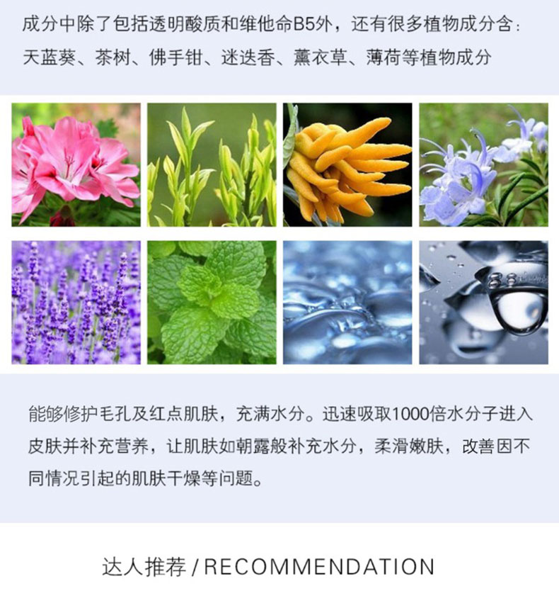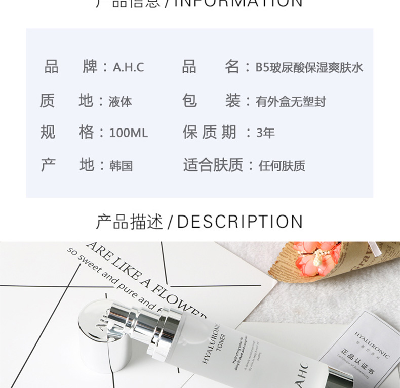 直郵AHC玻尿酸B5神仙水爽膚水100ml 開啟涂抹式玻尿酸時代 一瓶/兩瓶—— 1、含玻尿酸及天竺葵、茶樹、薰衣草、薄荷等植物護膚精粹。 2、小分子、易吸收,清爽不黏膩。 3、補水保濕、收縮毛孔、加強肌膚再生能力。 |