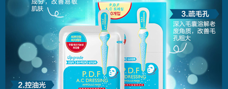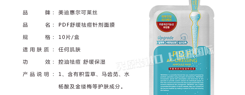 直郵美迪惠爾可萊絲PDF舒緩祛痘針劑面膜 清透無瑕秘訣 讓粉刺痘痘統(tǒng)統(tǒng)隱形10片/盒 1盒/2盒—— 1、含有積雪草、馬齒莧、水楊酸及金縷梅等護(hù)膚成分。 2、生物長纖維面膜,無縫貼合,吸收加倍。 3、控油祛痘、舒緩保濕。 |