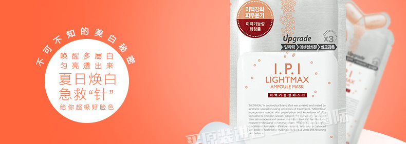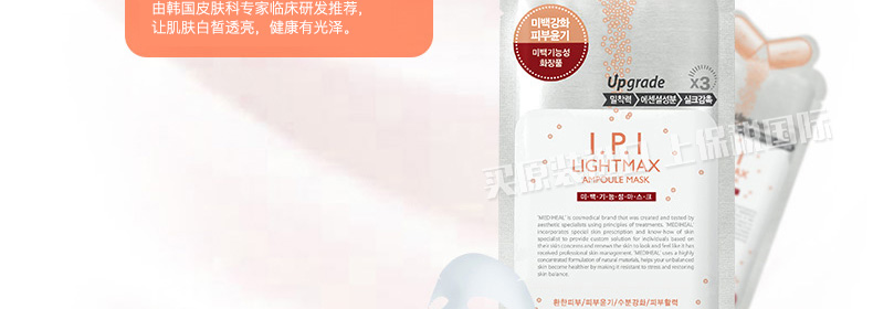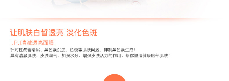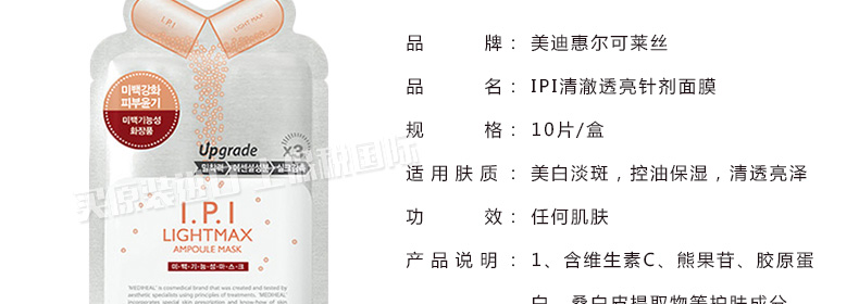 直郵美迪惠爾可萊絲IPI清澈透亮針劑面膜美白淡斑面膜 不可不知的白皙秘密10片/盒 1盒/2盒—— 1、含維生素C、熊果苷、膠原蛋白、桑白皮提取物等護膚成分。 2、長纖維面膜紙,貼合親膚不刺激。 3、美白淡斑,控油保濕,清透亮澤。 |
