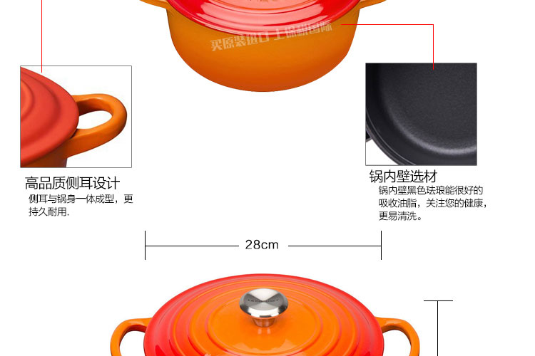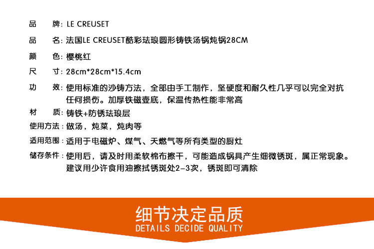 法國LE CREUSET酷彩琺瑯湯鍋燉鍋櫻桃紅色28CM 耐久好用營養(yǎng)入味—— 1、標準沙鑄方法,手工制作,超強堅硬度和耐久性。 2、加厚鐵磁鍋底,超高保溫傳熱性能。 3、熬湯燉菜燉肉都能做,任何爐具都能用。 |