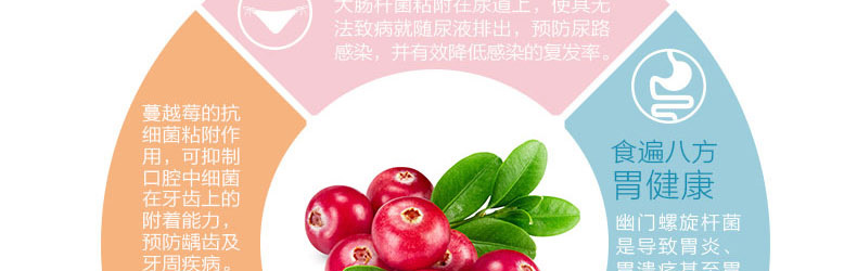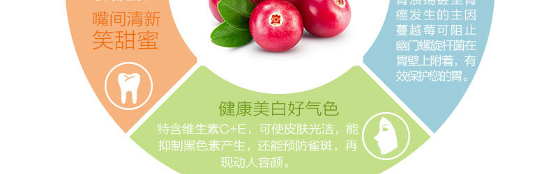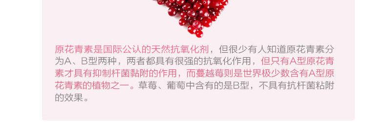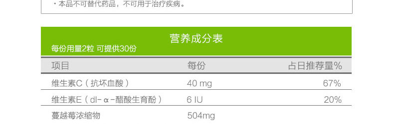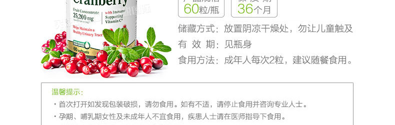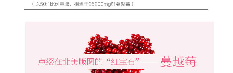 1、高含量,更健康,每粒相當于25200mg新鮮蔓越莓。 2、配方更科學,添加VC、VE,協同作用,美麗更健康。 |