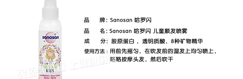 商品名稱 | 哈羅閃Sanosan兒童專用順發噴霧125ml 讓寶寶愛上一梳到底的柔順 | ||