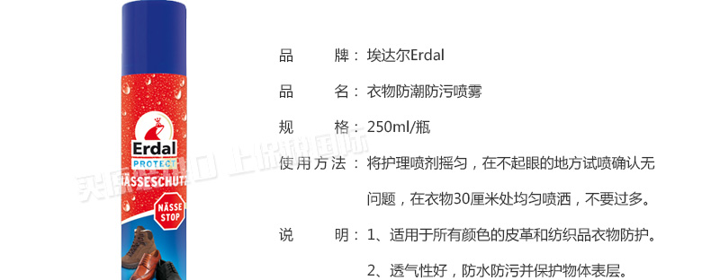 埃達(dá)爾Erdal鞋子皮革衣物防潮防污噴霧 250ml 給你貼身的防護(hù)—— 1、適用于所有顏色衣物的防潮防污。 2、透氣性好,防潮防污并保護(hù)物體表層。 |