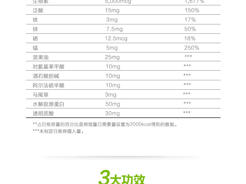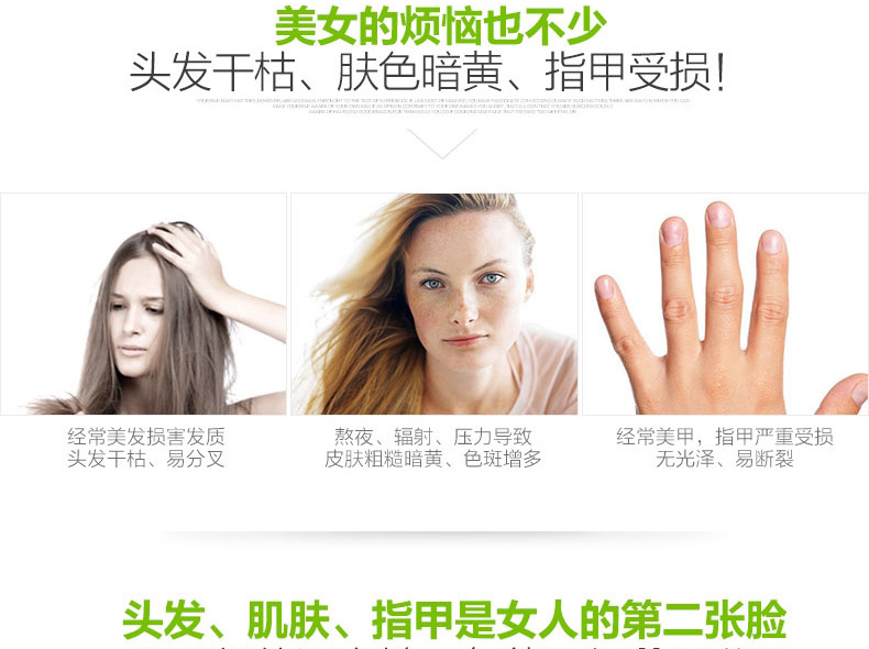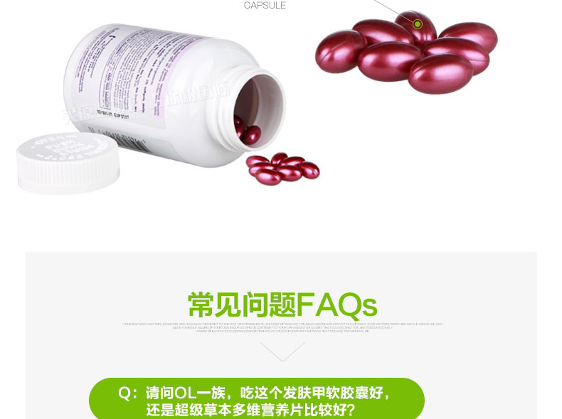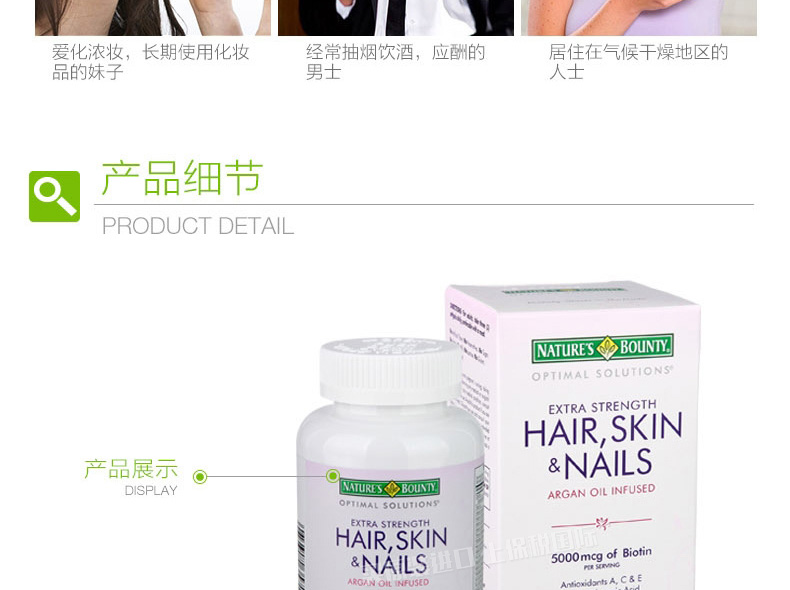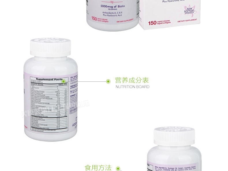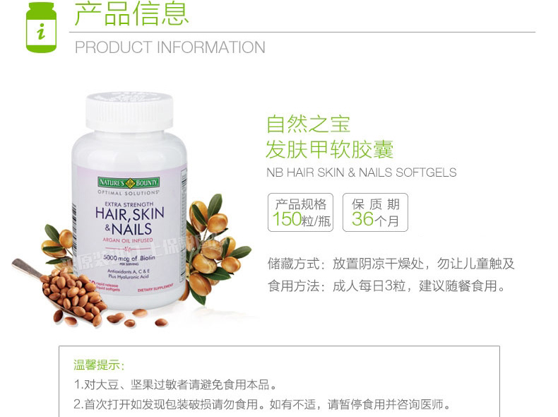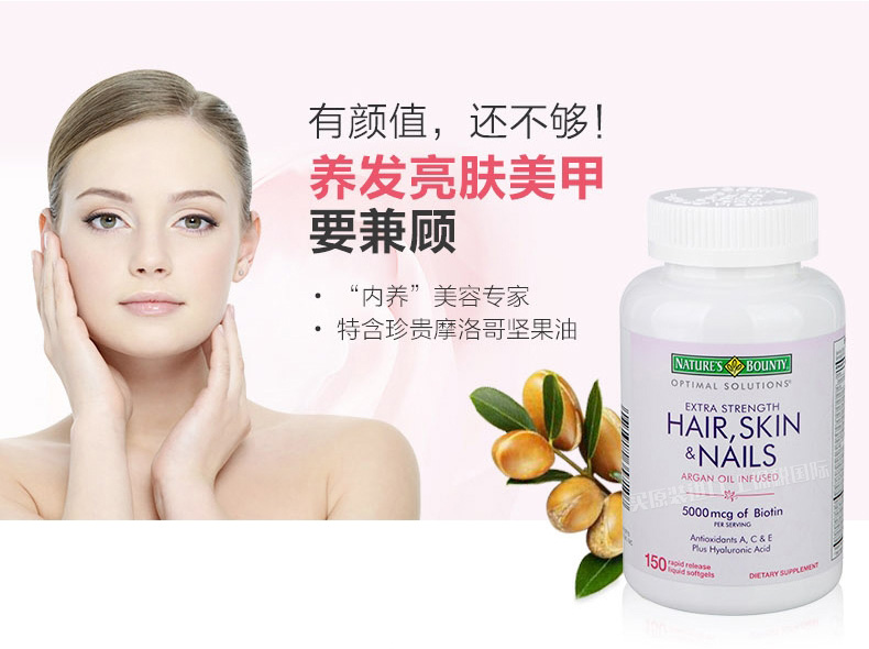 自然之寶Nature's Bounty發膚甲營養軟膠囊150粒 全面解救發膚甲“營養不良”—— 1、富含透明質酸、膠原蛋白及多種維生素和微量元素。 2、快速崩解釋放的液體膠囊劑型,吸收迅速。 3、改善發質,滋養肌膚,保護指甲。 |