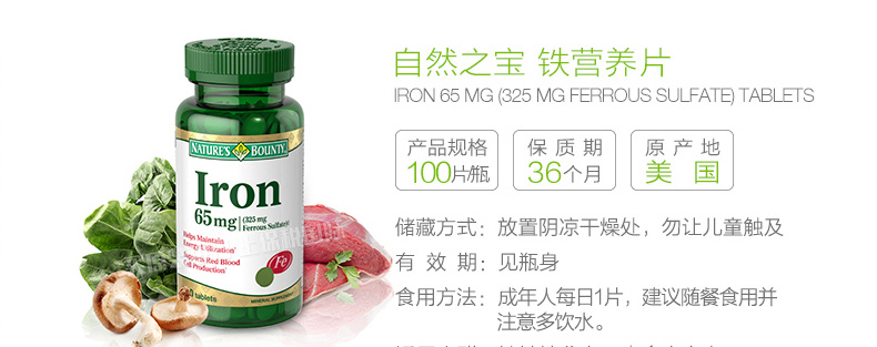 商品名稱 | 自然之寶Nature's Bounty鐵元素營養片100片 補鐵補血滋養生命活力 | ||