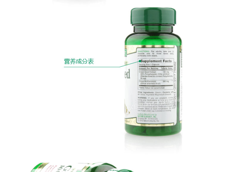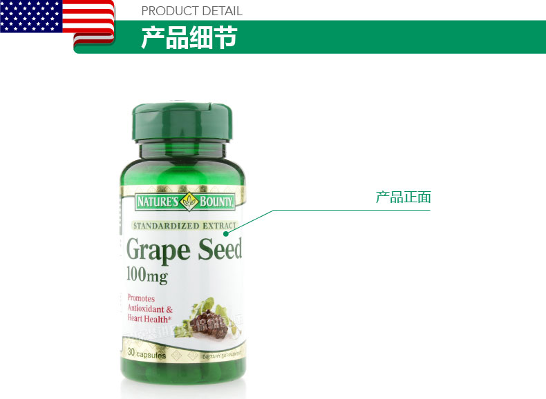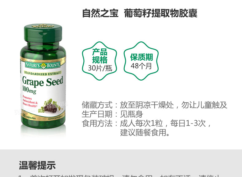 美國(guó)自然之寶Nature's Bounty 自然之寶 葡萄籽提取物膠囊 美白抗衰老 口服化妝品 30粒/瓶 |