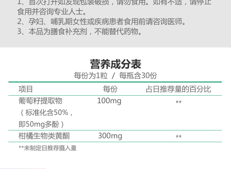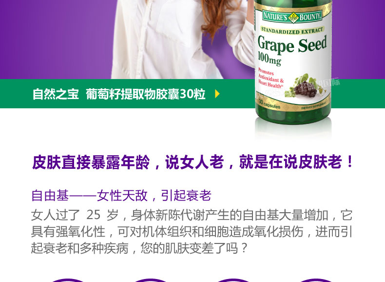 美國(guó)自然之寶Nature's Bounty 自然之寶 葡萄籽提取物膠囊 美白抗衰老 口服化妝品 30粒/瓶—— 1、長(zhǎng)期食用葡萄籽,能夠清除體內(nèi)自由基,延緩衰老。 2、原花青素有助減少肌膚色斑皺紋,增加膠原蛋白,讓皮膚彈潤(rùn)光滑。 |