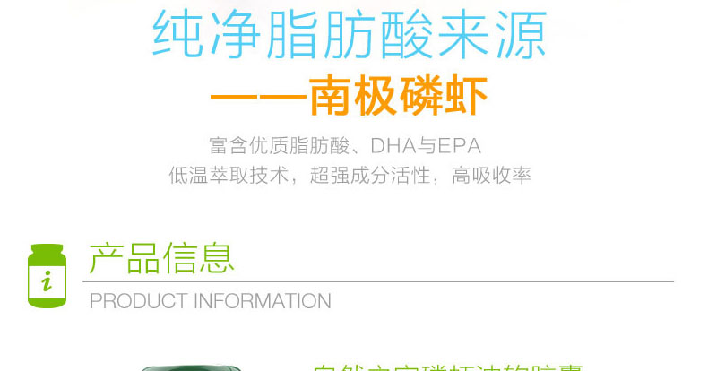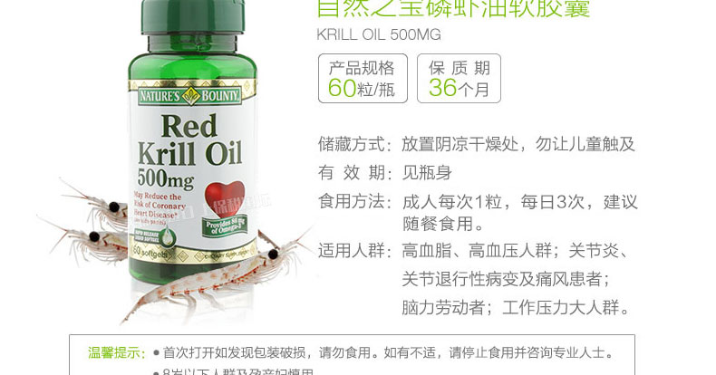 自然之寶Nature's Bounty磷蝦油軟膠囊60粒 降低血脂健腦益智延緩衰老 純凈脂肪酸來源—— 1、富含蝦青素、磷脂,DHA和EPA等成分。 2、南極深海磷蝦提取,天然無污染。 3、降低血脂,健腦益智,保護視力,延緩衰老,提高免疫力。 |