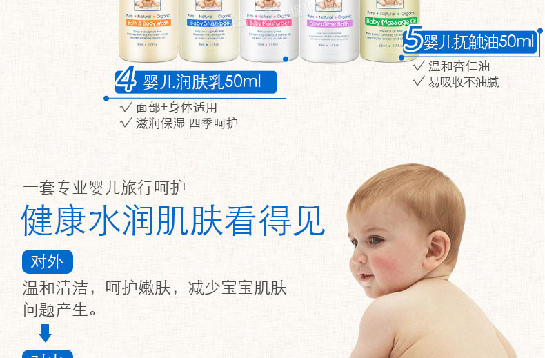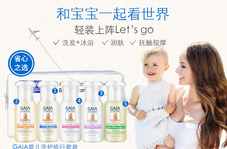 2套裝澳洲GAIA兒童洗護5件套裝旅行裝50ml*5/套 清潔潤膚滋養一套搞定—— 1、沐浴露+洗發露+保濕潤膚乳+舒緩潤膚乳+按摩油組成。 2、清潔潤膚,舒緩滋養。 3、便于攜帶的旅行裝。 |