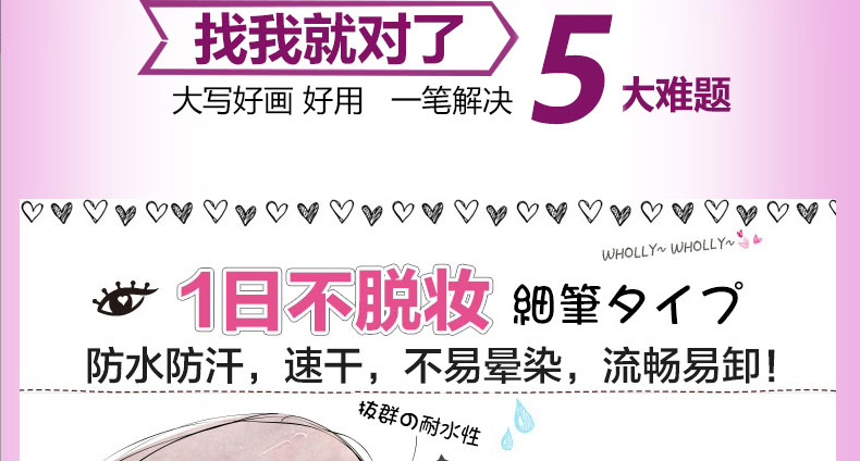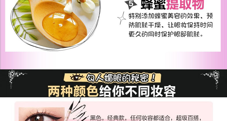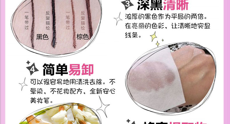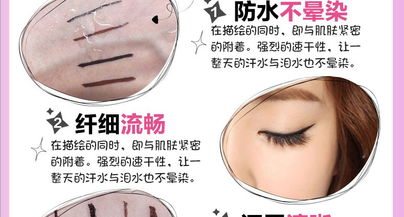 1、筆頭極細(xì)有韌性。 2、超強耐水性,配合4種保濕成分,親膚又防水。 3、持久不脫妝,溫水即可簡單卸除。 |