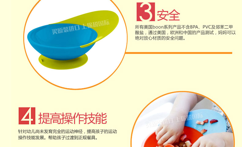 美國潮牌Boon吸盤碗 防落食吸碗碟 寶寶訓(xùn)練碗 兒童餐碗 不含BPA 粉紫 藍(lán)橙 藍(lán)綠3三色任選—— 1、材質(zhì):聚丙烯,熱塑性彈性體,不含BPA,不含PVC。 2、溫水洗碗機(jī)或手洗,不可用微波爐加熱或消毒,也不要用開水燙。 |